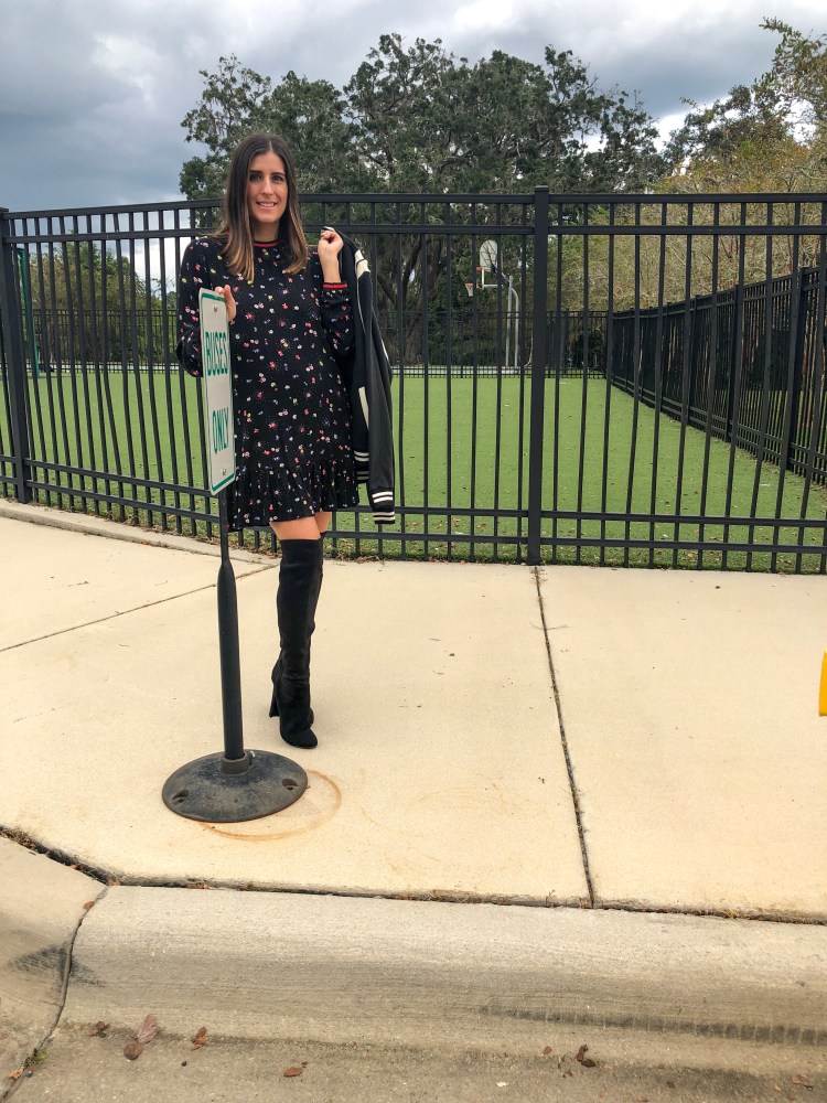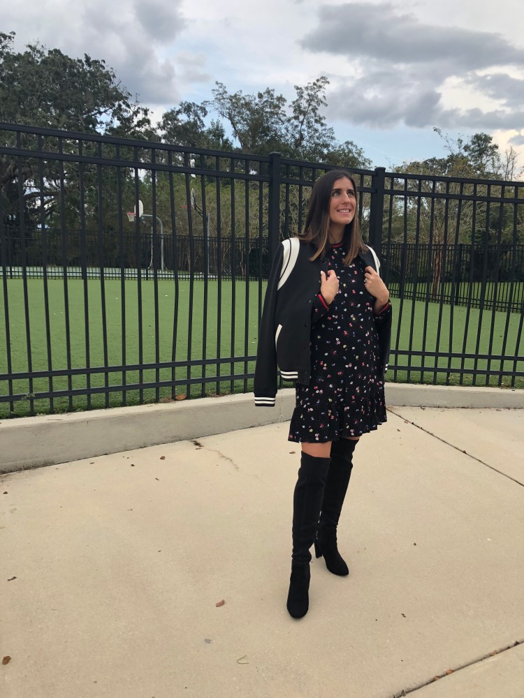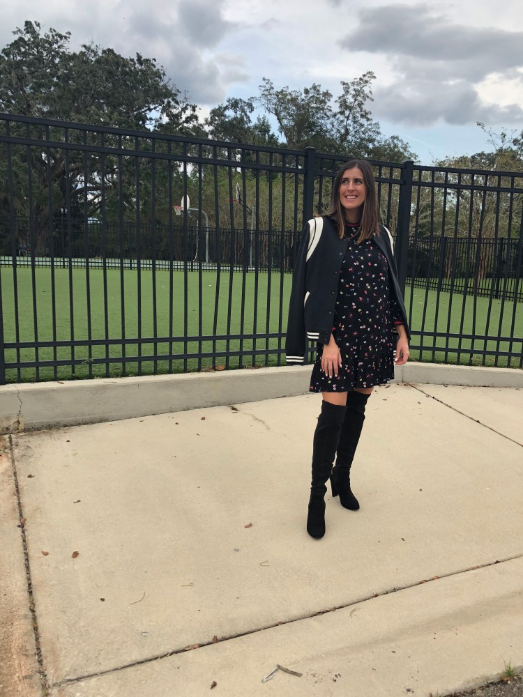 This is a fun look that is super simple to pull off. I love dresses because in one piece you have a finished look. Paired with tall boots and the bomber jacket, you have a complete fall look!