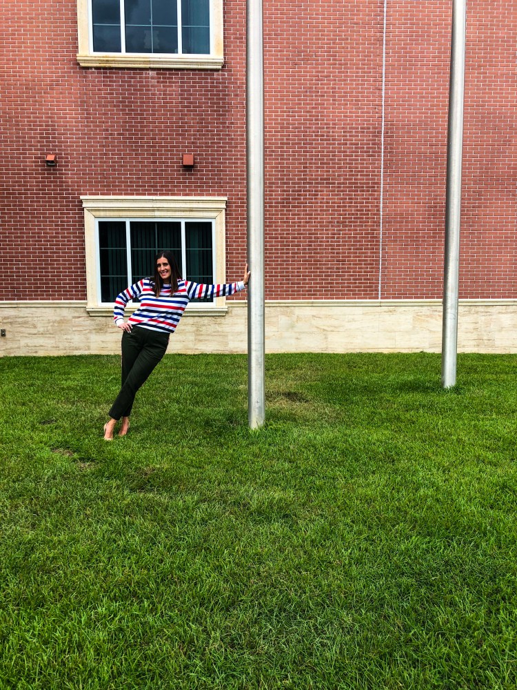 This is all the about the stripes!! I absolutely loved the military/cruise director inspired pants, but wanted to make it more whimsical and fun by adding a colorful sweater for a stripes on stripe combo.