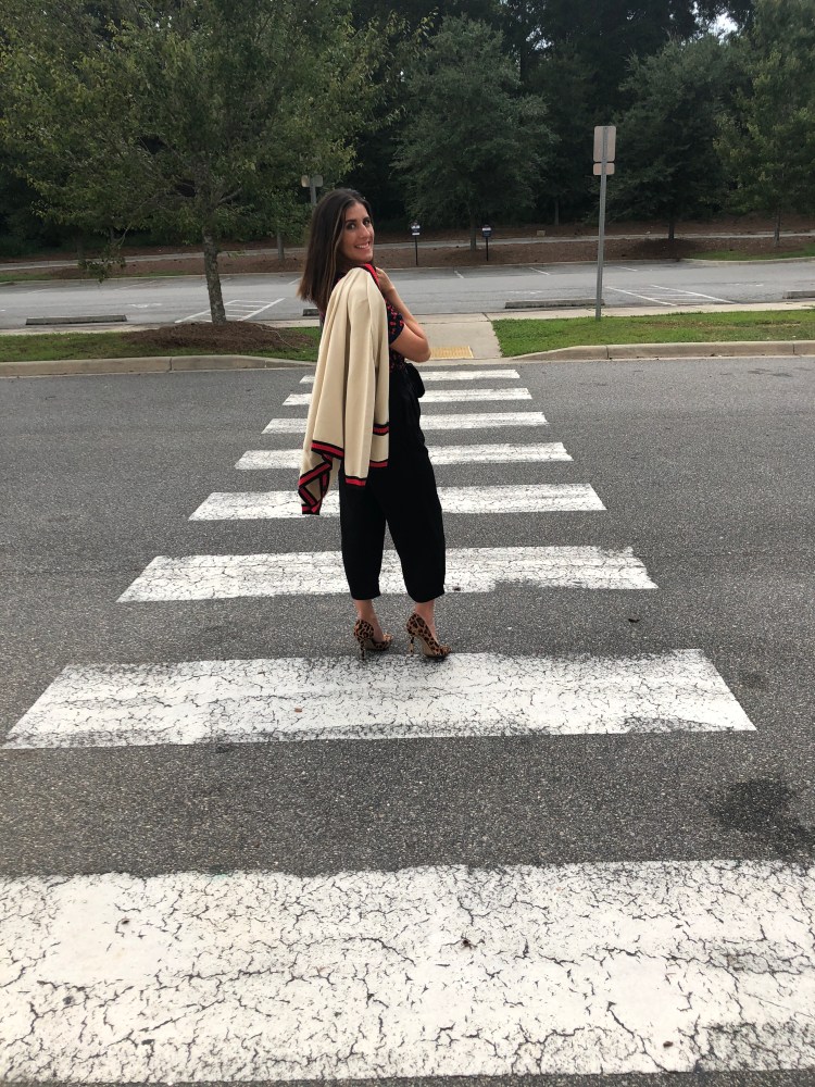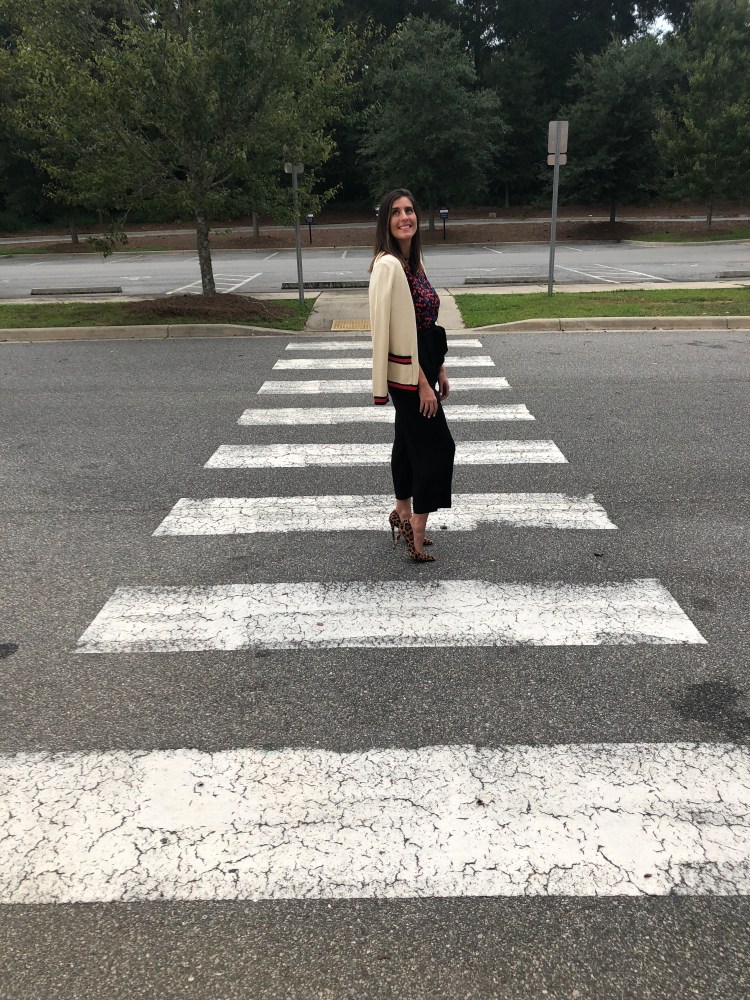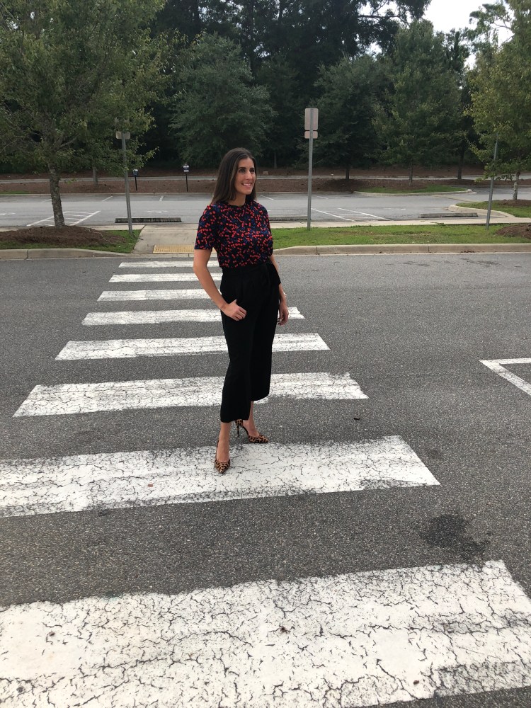 I love a great pair of pants that can take you from the office to happy hour and beyond. I’m also a huge fan of pattern mixing, so when I saw this cherry top, I immediately knew I would also rock my leopard heels to add a little fun and edge to this look. I finished it off with a preppy cardigan for an added layer of interest!