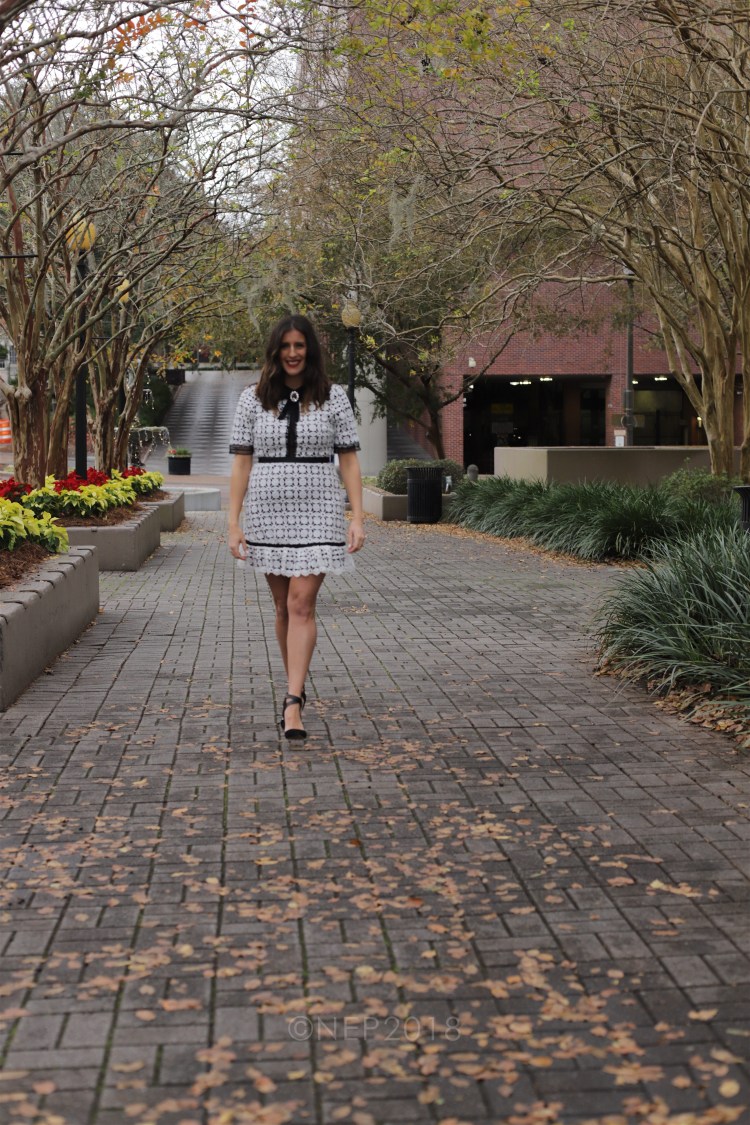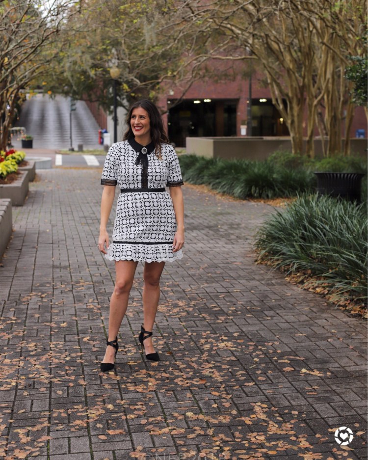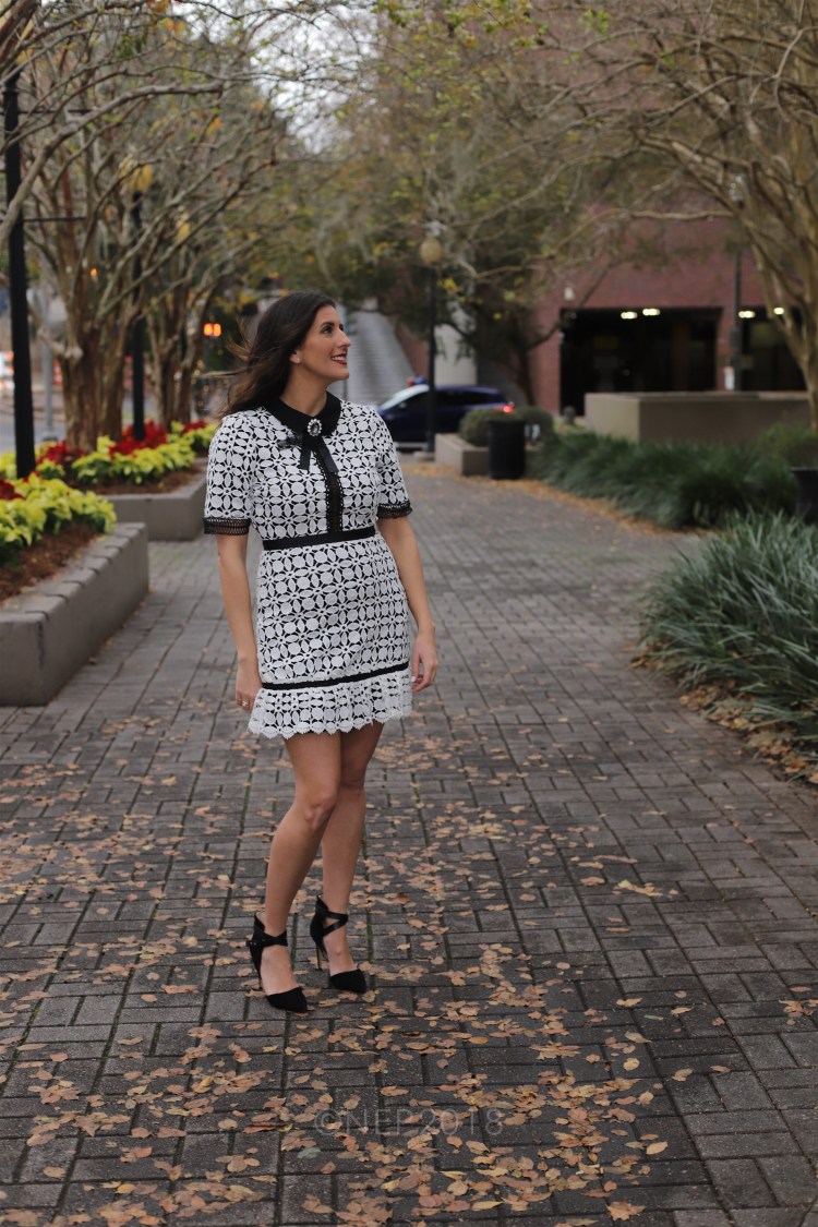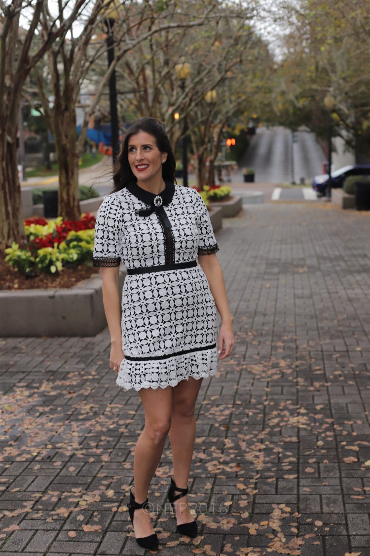 This white lace dress with black underlay and collar detail, definitely delivers!