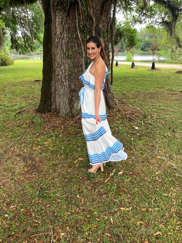 This maxi screams vacation! The blue and white, one-shoulder and ruffles are beach worthy.