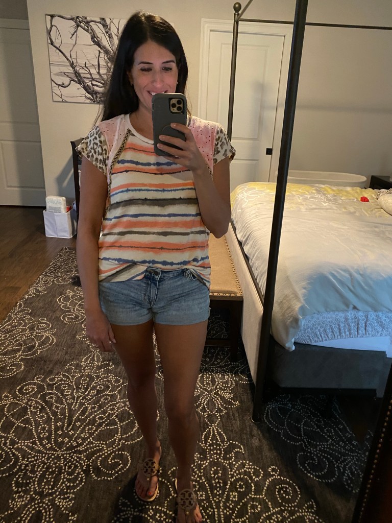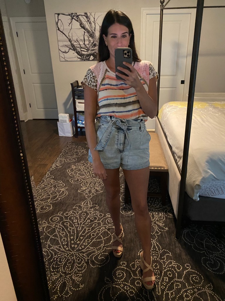 Look #3 – Day date. Elevate this tee with paper bag denim shorts and wedge heels!
