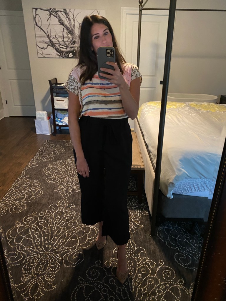 Look #2 – Turn this tee into a work outfit by pairing with wide leg black pants and neutral heels